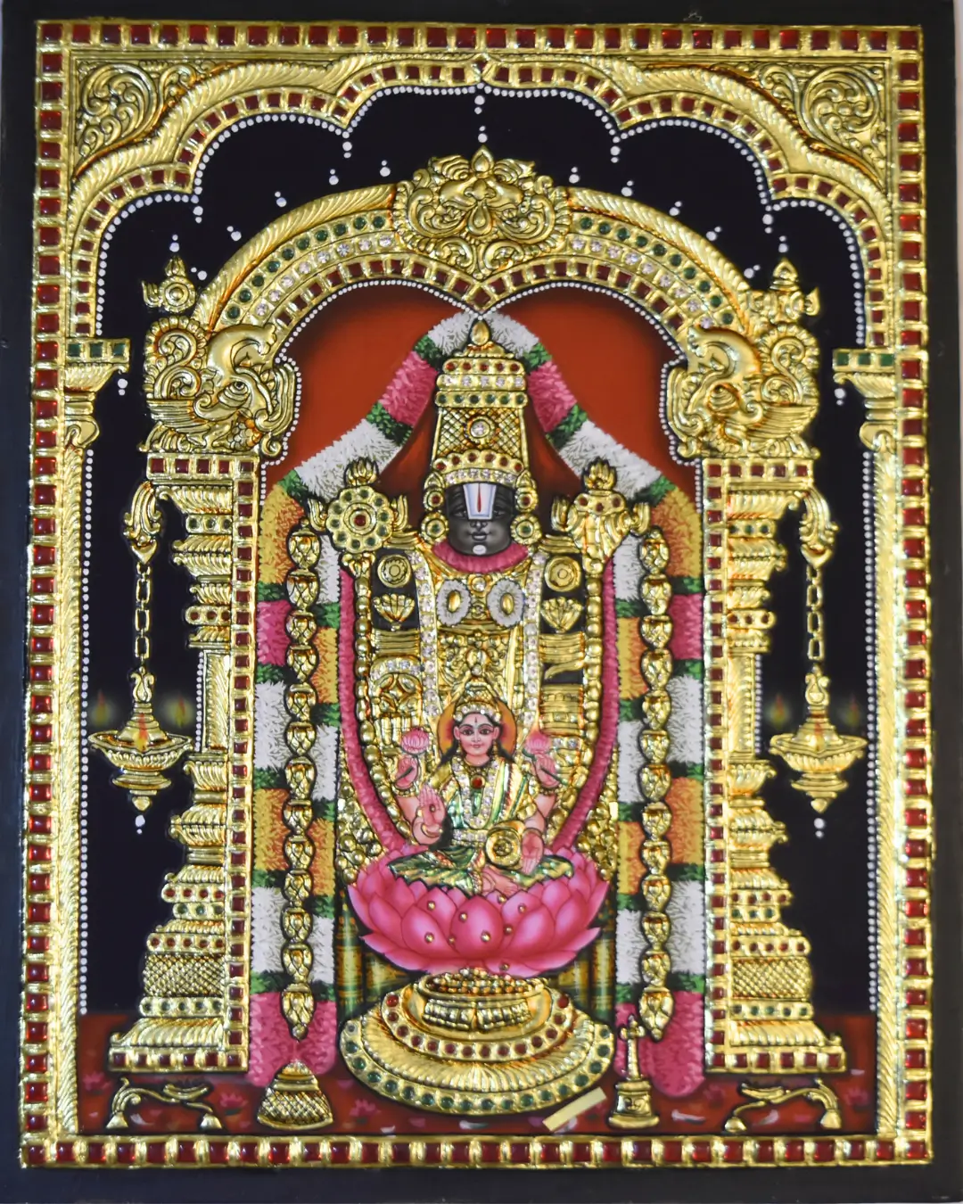 The elegant teak wood frame paired with protective glass enhances the brilliance of 24K gold foil work, giving the painting a luxurious and lasting finish.