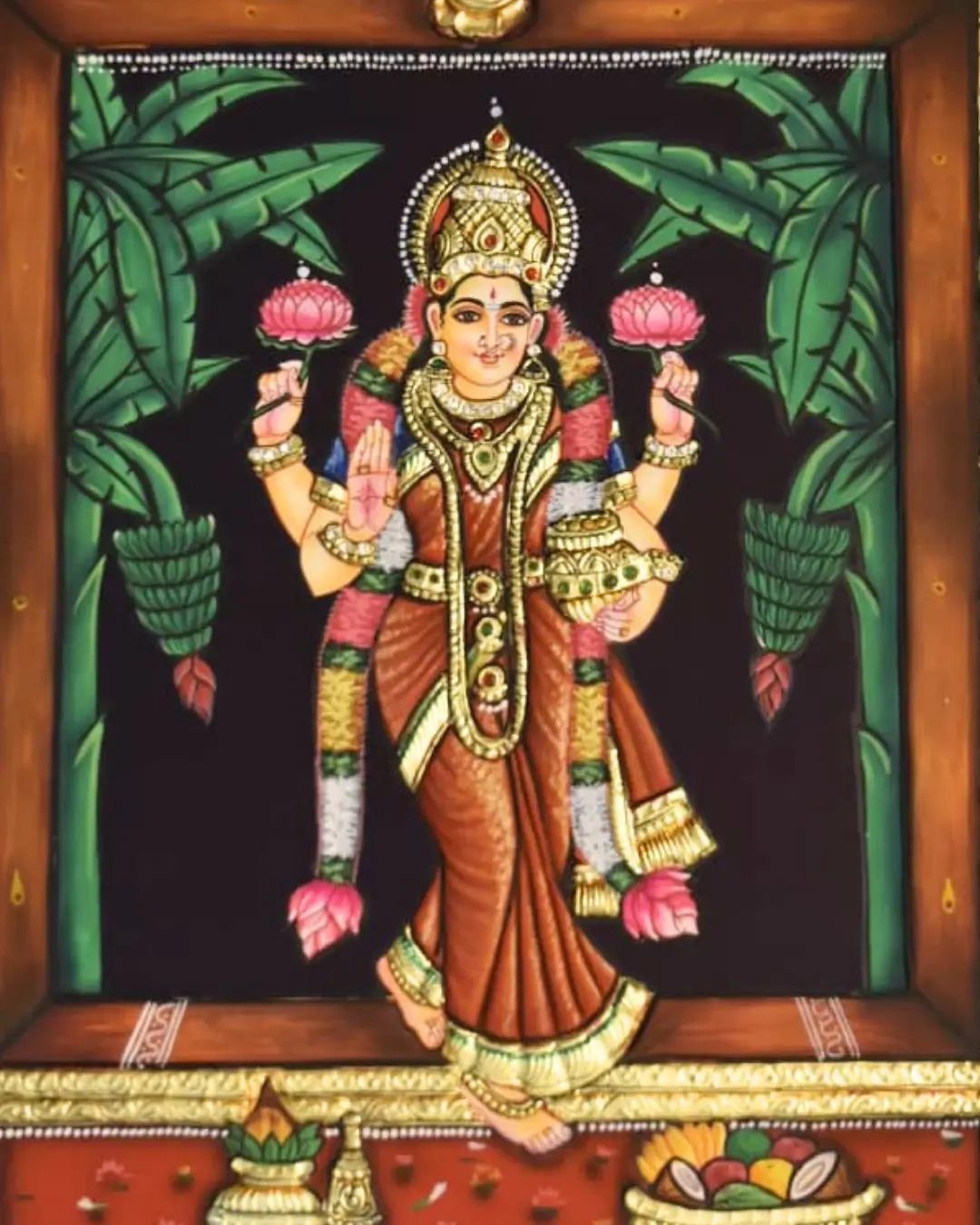 Expertly framed in teak wood and secured with protective glass, this Tanjore painting enhances the richness of 24K gold accents with a royal and polished look.