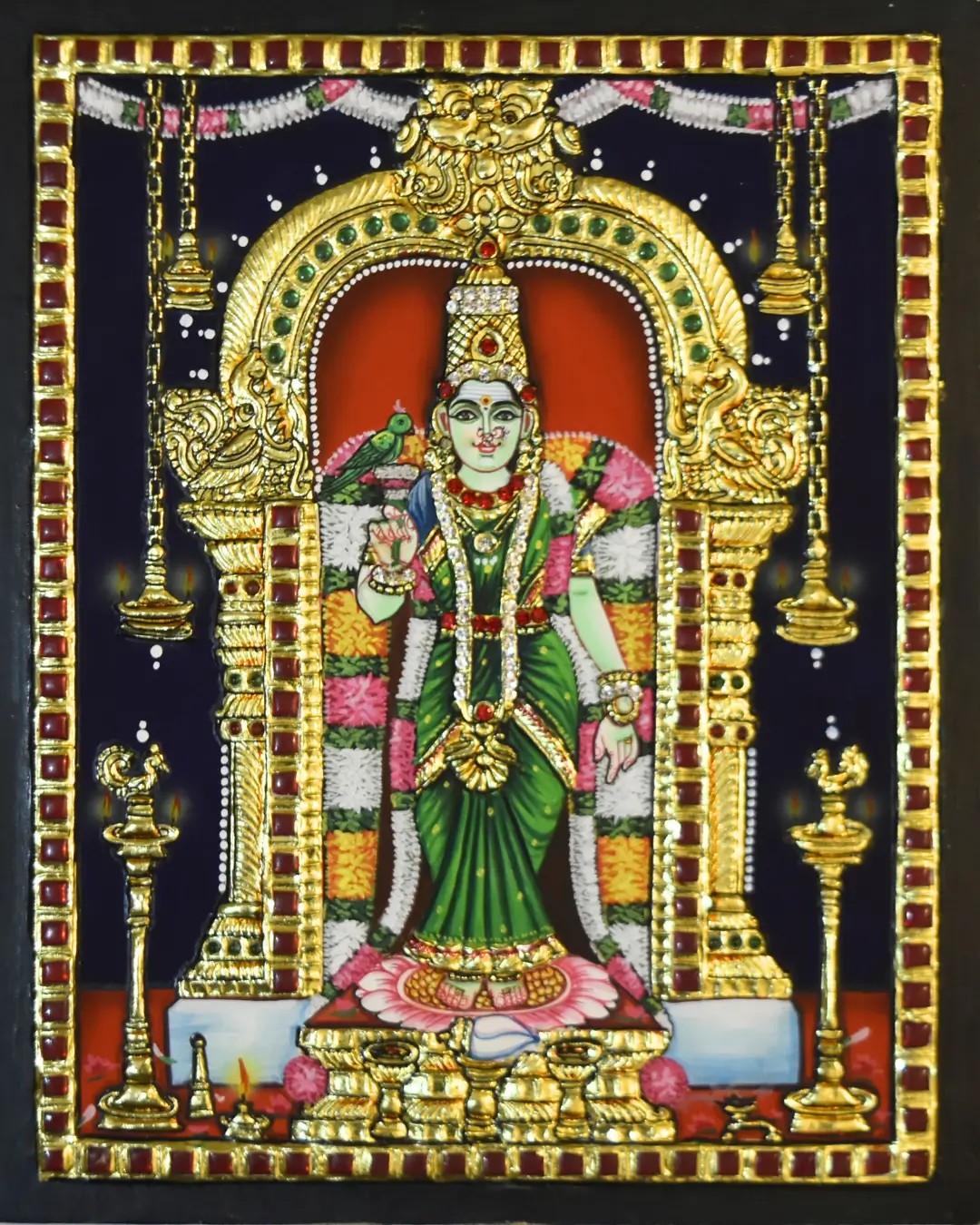 An elegantly designed teak wood frame with protective glass highlights the brilliance of 24K gold work, ensuring long-lasting durability and a refined, royal appearance that enhances the beauty of your Tanjore painting.
